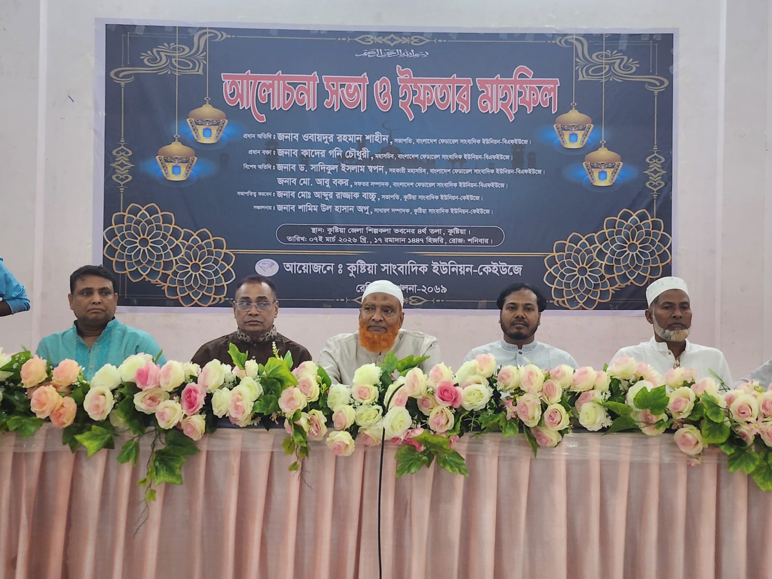 পবিত্র মাহে রমজান উপলক্ষে কুষ্টিয়া সাংবাদিক ইউনিয়ন–কেইউজের উদ্যোগে আলোচনা সভা ও ইফতার মাহফিল অনুষ্ঠিত হয়েছে। এতে জেলার বিভিন্ন গণমাধ্যমে কর্মরত সাংবাদিকরা অংশ নিয়ে পেশাগত অধিকার, ঐক্য ও দায়িত্বশীল সাংবাদিকতার গুরুত্ব তুলে ধরেন।
