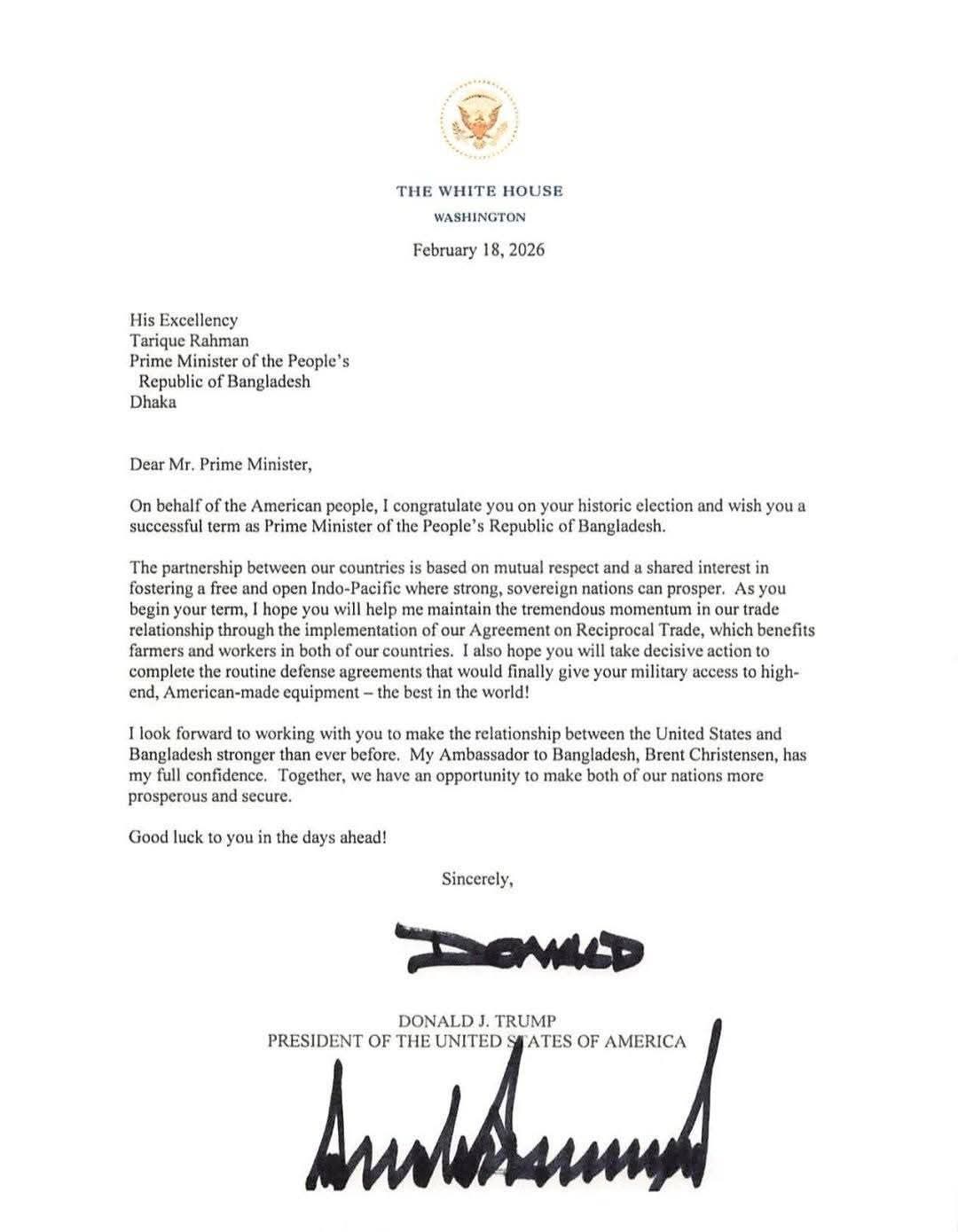 আমি যুক্তরাষ্ট্র ও বাংলাদেশের সম্পর্ককে আগের চেয়ে আরও শক্তিশালী করতে আপনার সঙ্গে কাজ করার প্রত্যাশা করছি। বাংলাদেশে আমার রাষ্ট্রদূত ব্রেন্ট ক্রিস্টেনসেনের প্রতি আমার পূর্ণ আস্থা রয়েছে। একসঙ্গে আমরা আমাদের উভয় দেশকে আরও সমৃদ্ধ ও নিরাপদ করার সুযোগ পেয়েছি।