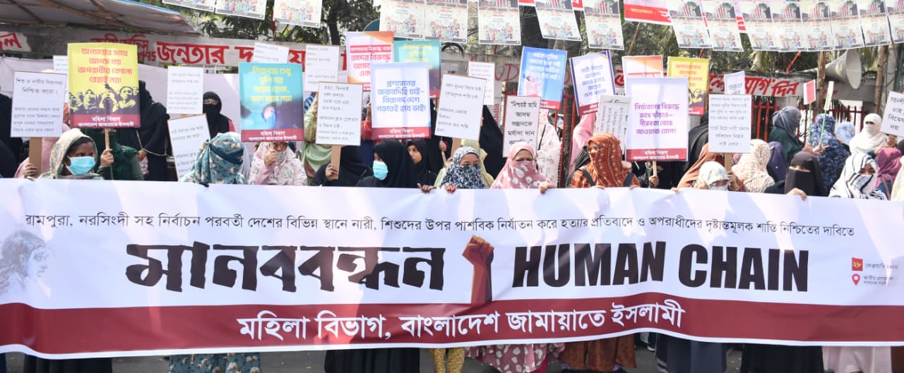 নির্বাচন পরবর্তী দেশের বিভিন্ন স্থানে নারী ও শিশুদের উপর পাশবিক নির্যাতন করে হত্যার প্রতিবাদে ও অপরাধীদের দৃষ্টান্তমূলক শাস্তি নিশ্চিতের দাবিতে মানববন্ধন করেছে বাংলাদেশ জামায়াতে ইসলামীর মহিলা বিভাগ।  শনিবার রাজধানীর জাতীয় প্রেসক্লাবের সামনে এই মানববন্ধন আয়োজিত হয়। মানববন্ধনে নারী ও শিশু নির্যাতন বন্ধে ১০ দফা দাবি জানানো হয়।